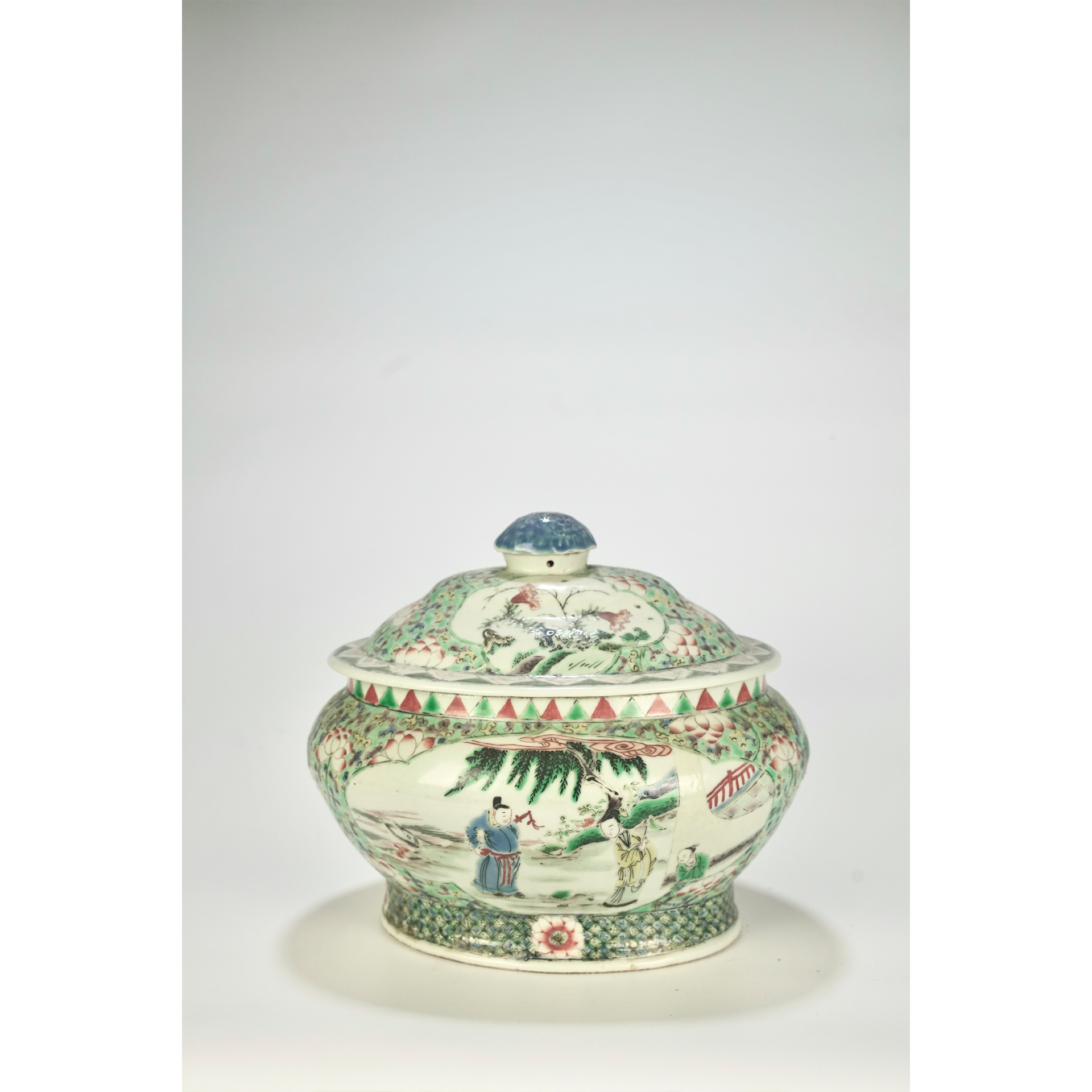 LOT 087 A 18th-century Chinese wucai (polychrome) egg-shaped porcelain lidded jar decorated with court figures
