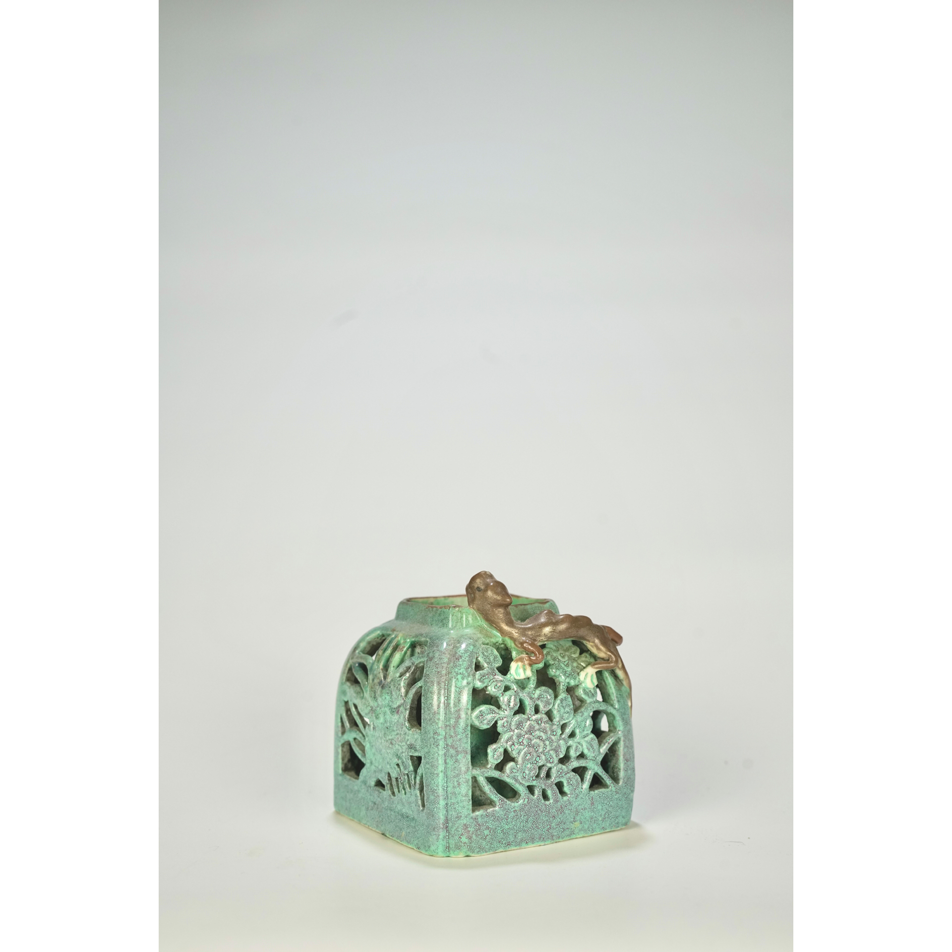 LOT 089 A 19th-century Chinese green openwork square porcelain jar with a brown gecko decorated on the mouth