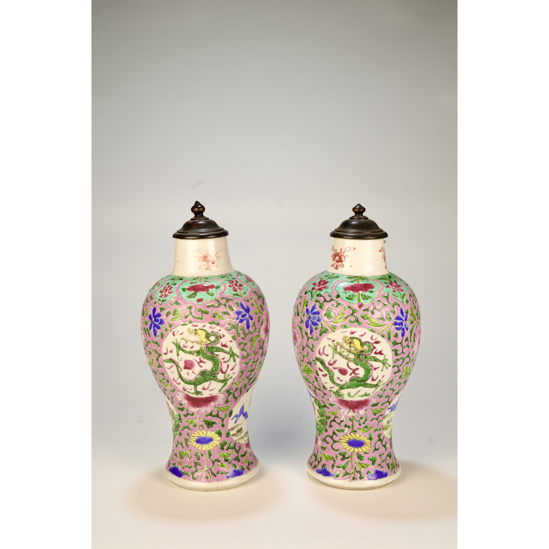 LOT 120 A pair of 18th-century Chinese famille rose porcelain vases decorated with flowers and dragon patterns